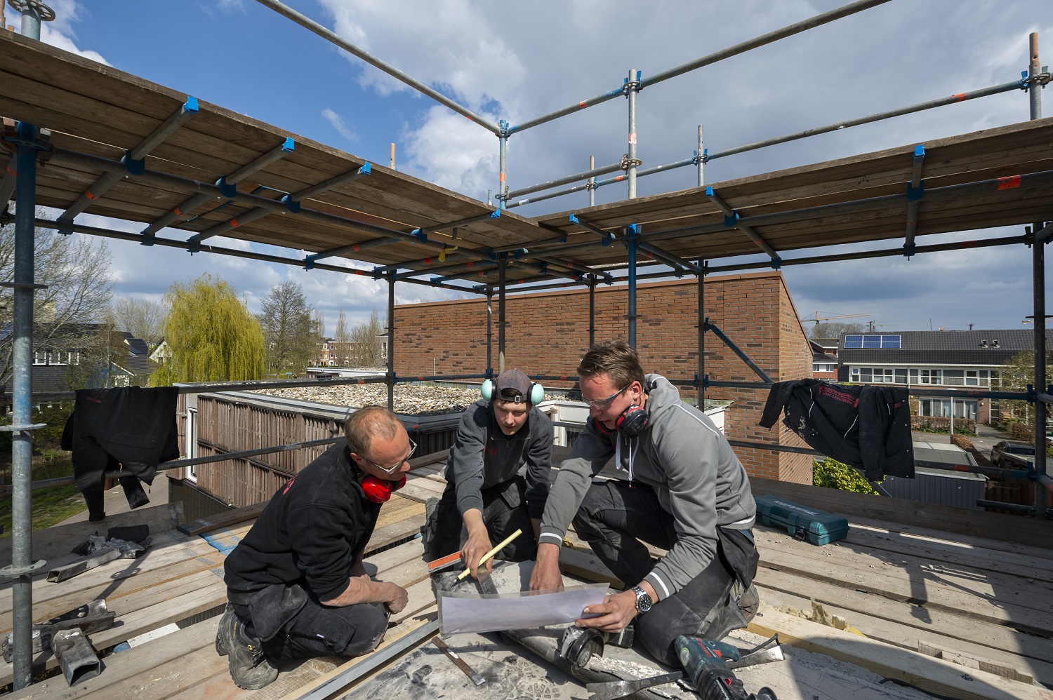 “Voordat de bouw startte, waren we er al een jaar of vijf mee bezig. Wat te doen met het platte dak? Hoe kunnen we die bij de woning betrekken? De meeste van ons vormen namelijk gezinnen met drie kinderen. Ze vinden hun huizen erg leuk, maar zien ook wel in dat de slaapkamers boven niet zo groot zijn. Het creëren van een extra kamer, met mogelijk een tweede badkamer, zou de gedachte om op termijn te verhuizen meteen wegnemen.