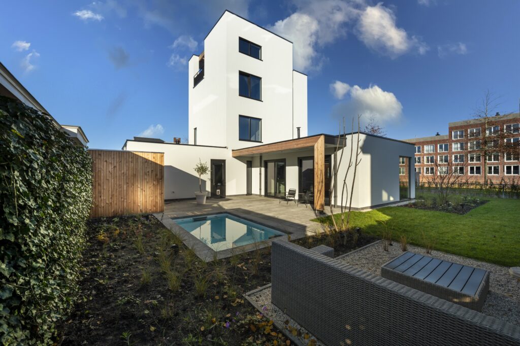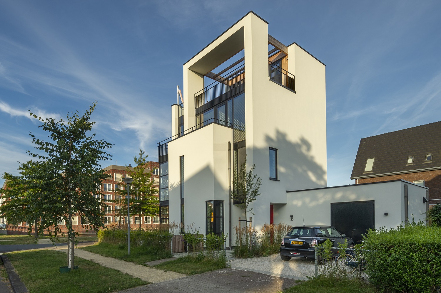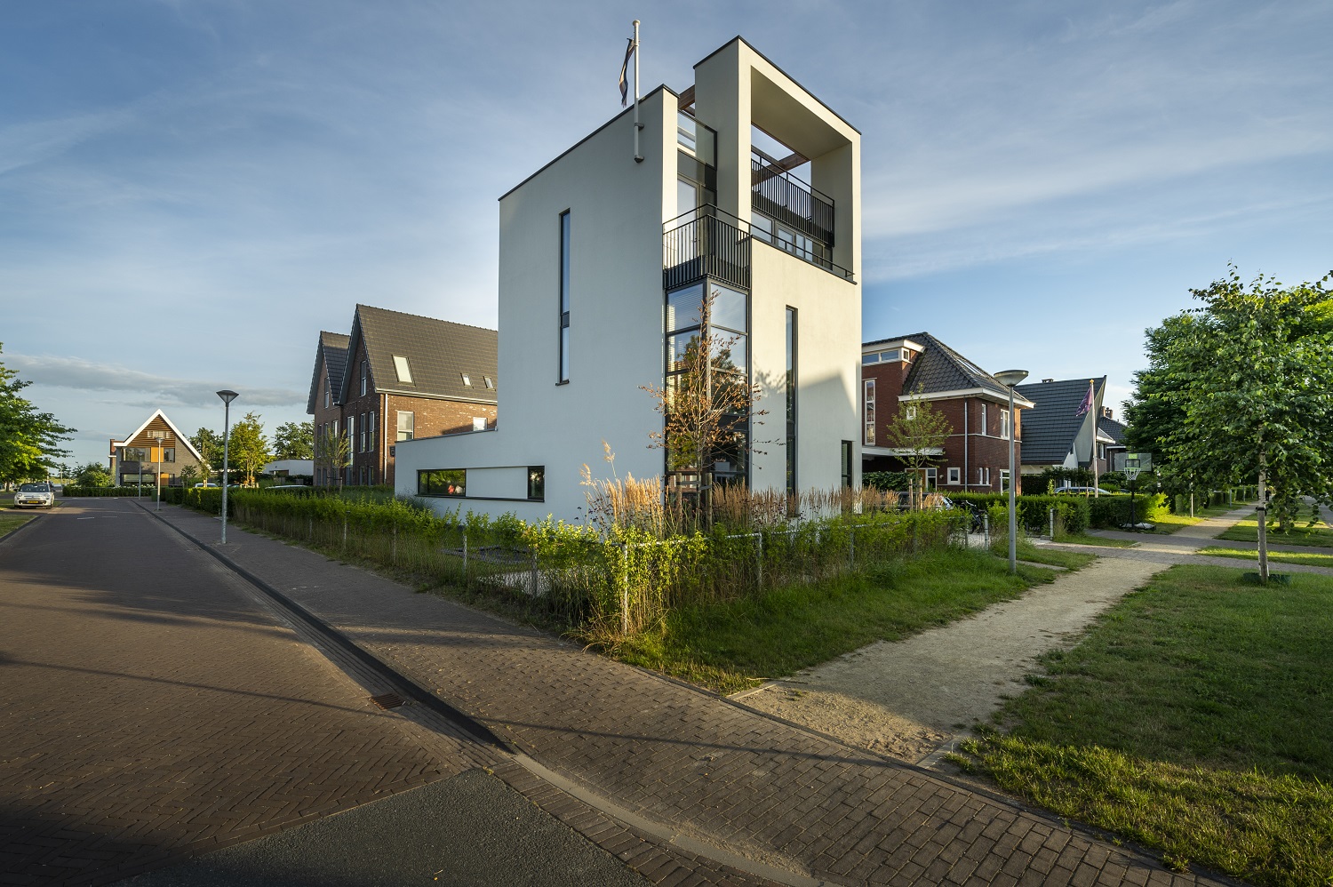 Justin: “De kavel waarop we ons huis hebben laten bouwen, hadden we al wat langer op het oog. Het ligt goed op een hoek, biedt vrij uitzicht, maakt contact met het water en ligt in de buurt van onze vorige woning. Dat laatste is vooral prettig voor onze kinderen die hier in de wijk op school zitten en hun vrienden hebben. Echt een mooie plek dus, maar wel één waarvan de gemeente specifieke eisen aan het woningontwerp stelde, die niet volledig met onze wensen overeenkwamen. Zo werd er bijvoorbeeld een bakstenen gevel voorgeschreven, terwijl wij aan stucwerk dachten.