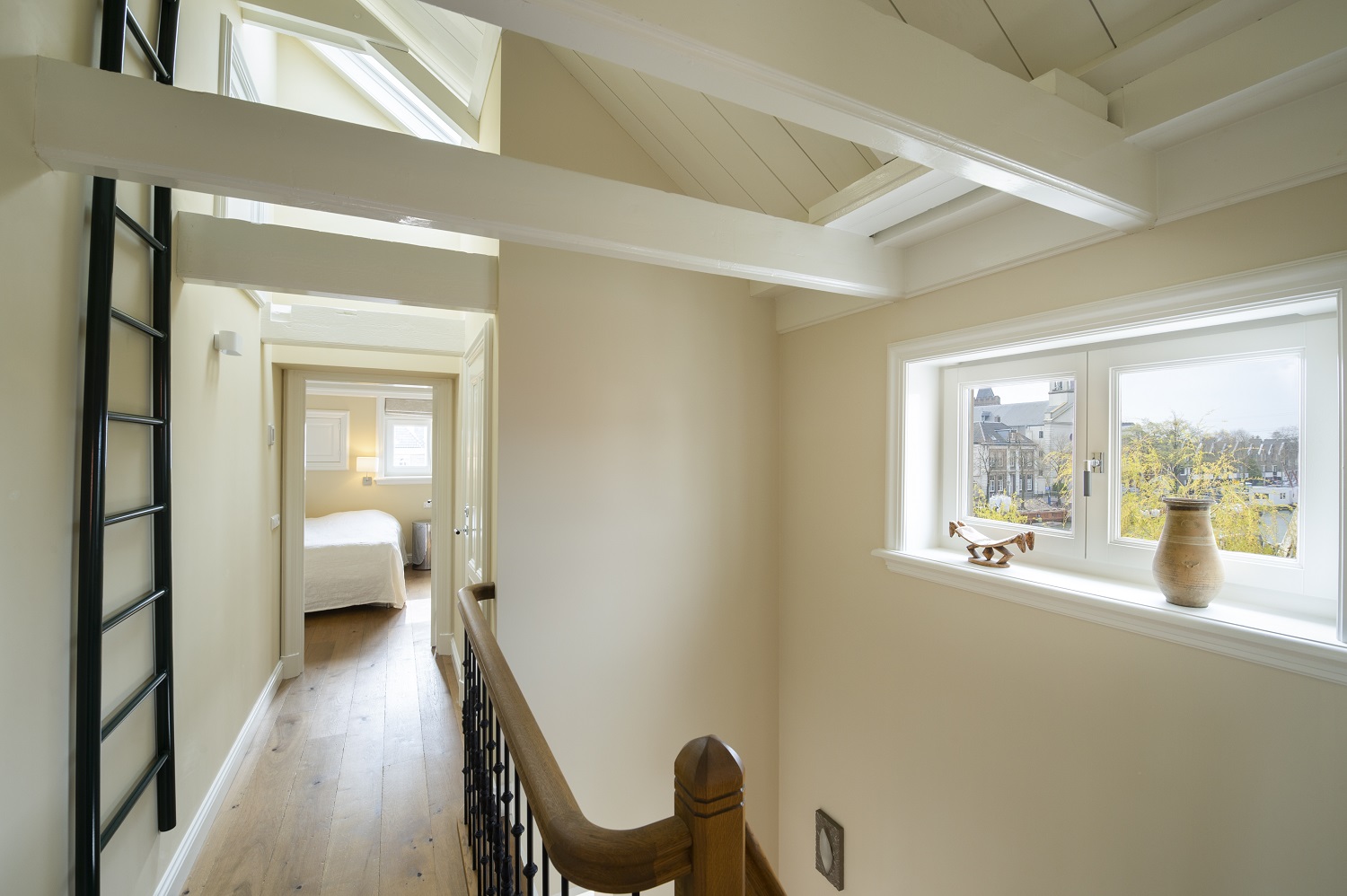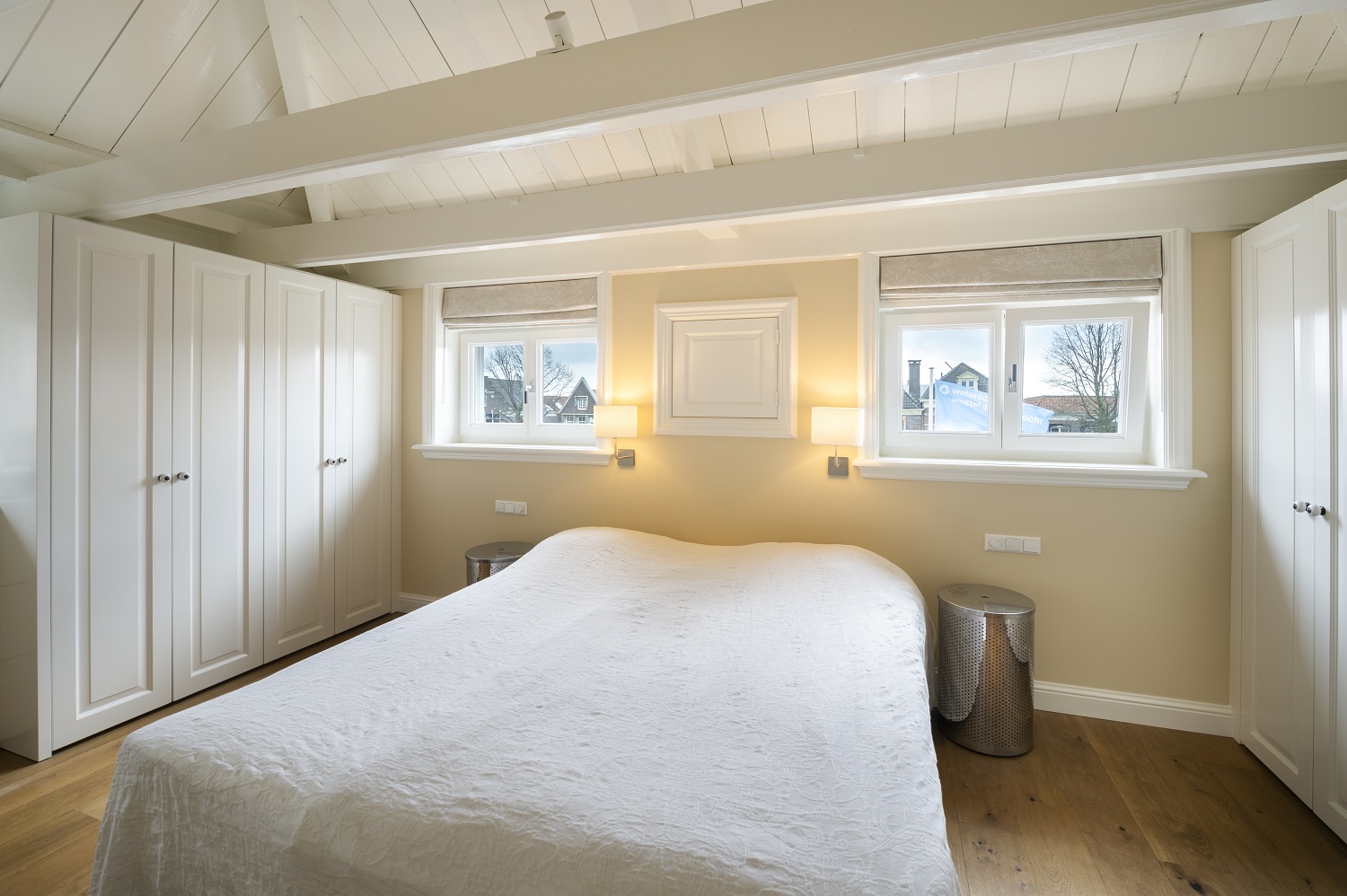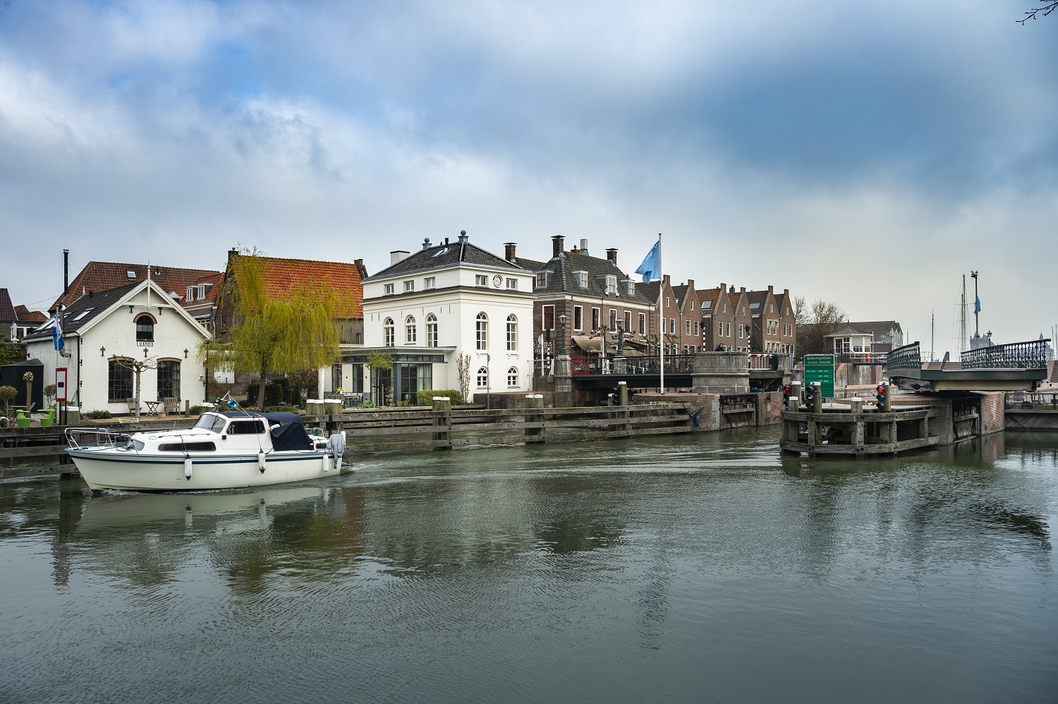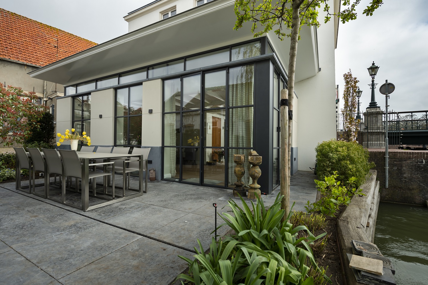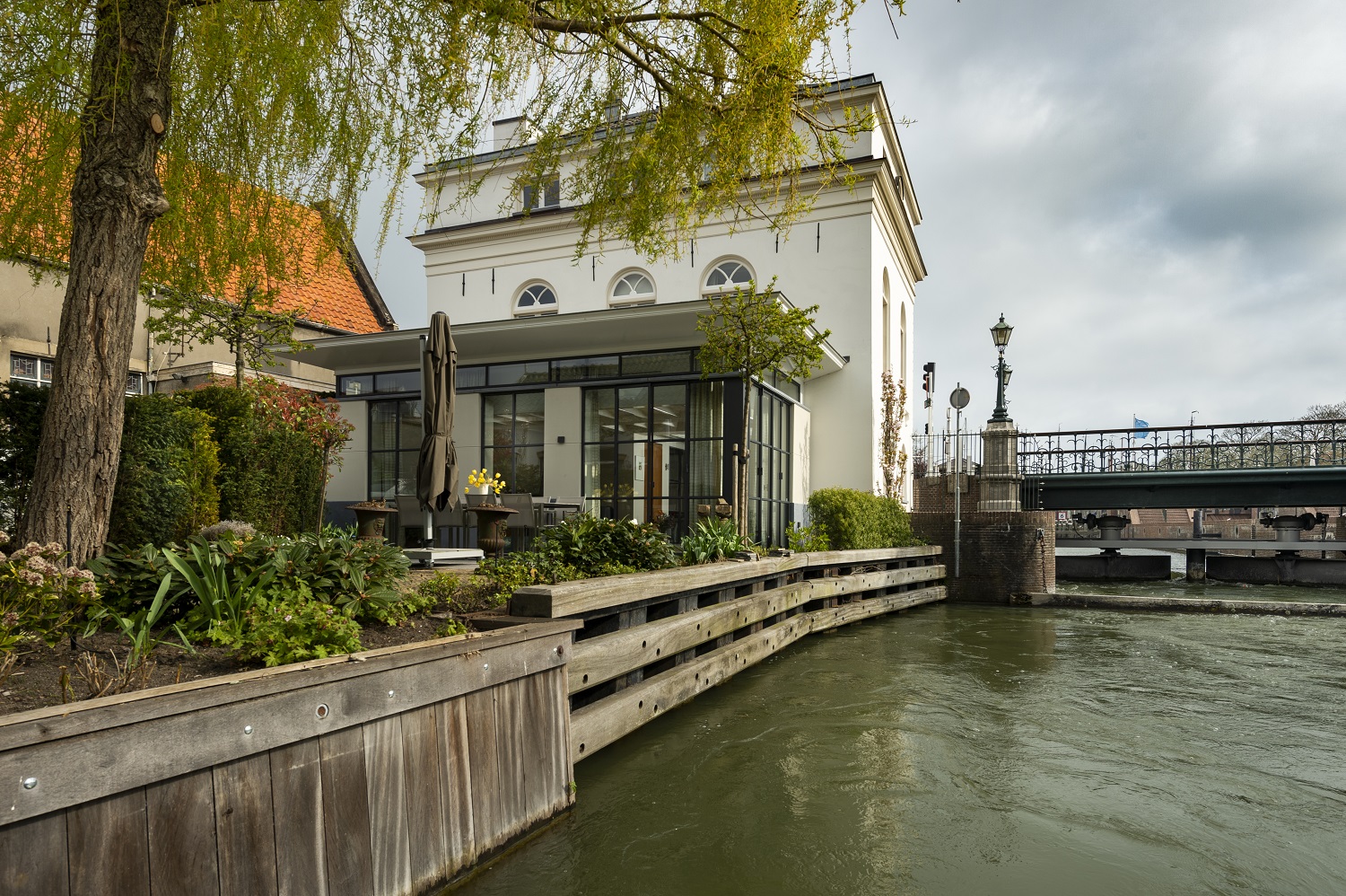 “In de gevel zit een plaquette die de historie beschrijft. Het sluishuis is een monument en staat op de meest markante plek van Muiden. Voordat mevrouw het kocht, vergaderden de hoge heren van het Waterschap er en was het nog niet bewoonbaar. Wij hebben het huis volledig gestript, van binnen opnieuw gebouwd en een aanbouw geplaatst. Bijzonder was dat de gevelklok aan de sluiszijde moest blijven lopen. Die geeft de tijd aan. Veel mensen rekenen daar schijnbaar op.