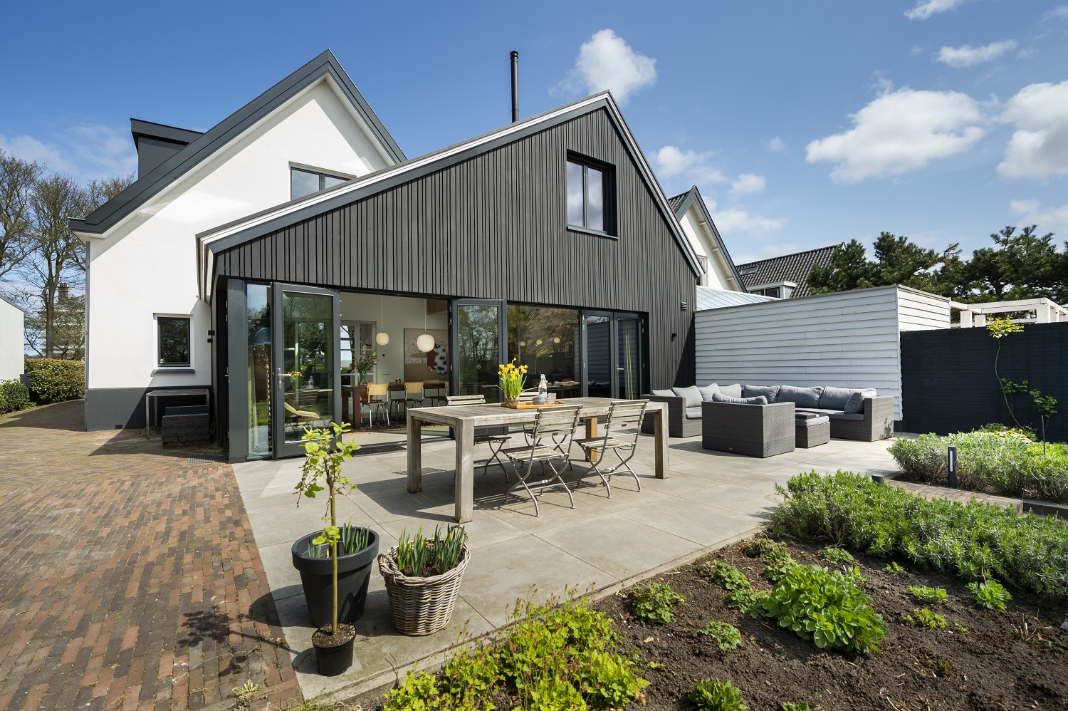 Daar er ook nog eens houtworm was het dak aan alle kanten lekte, bleek een grondige renovatie al snel de beste optie. Architectenbureau BNLA kreeg van ons de opdracht om het hoofdhuis in ere te herstellen, met dezelfde karakteristieke vorm in wit stucwerk als die van de 10 naastgelegen woningen in de straat. Voor de uitbouw aan de achterzijde koos de architect voor een contrasterend, modern uiterlijk in zwart hout. Echt mooi. Ondanks de verschillende vormen, oogt het huis als één geheel.