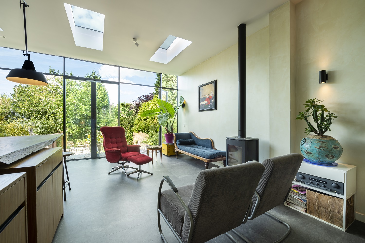 De opgave was ingewikkelder dan de foto’s laten zien. In de verplaatsing van balken, vloeren en trappen heeft zo veel werk gezeten. Dat doe je niet zomaar, dat is ingrijpend. Voordat Erwin de Maar, onze architect, zijn eerste schets maakte, hebben we met hem drie keer door de woning en tuin gelopen om de sfeer te proeven, te ontdekken welke mogelijkheden er waren en om te voelen of die bij onze liefde voor het huis pasten.